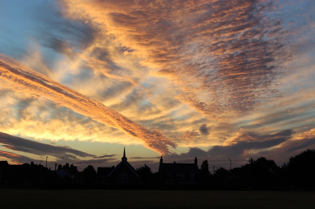 As we were. Looking towards the Methodist Church as the sun rises over the field opposite The Hand in Hand on Midsummer’s Day, 21st June 2018.