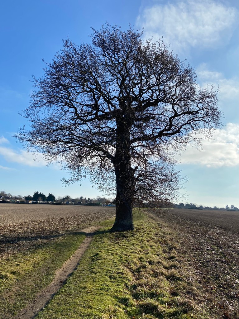 1) View of the new Poppyfields residential development alongside the public footpath towards Grimston Hall. February 2025. Note the new Foot Path sign. LR.2) A Trimley Carnival sign for Dodson Plumbing & Gas near overgrown foliage and directional signs. The start of the footpath leading across the field. June 2018. The distance to Grimston Hall would appear to have been less in 2018. LR.3) Along the footpath and towards Poppy Fields, taken during a walk in February 2025. LR.4) The footpath entered the field and this was the view behind the Bus Stop, looking towards Cavendish Grove. June 2018. LR.5) At the end of Nassau Drive, newly planted trees provide a new barrier crossing the pathway in the Poppy Field development. The image showcases the transition of land use in Trimley St. Martin. February 2025. LR.6) Looking back from the end of Nassau Drive, towards the High Road. LR.7) The footpath appears as a thin thread emerging from the end of Nassau Drive. February 2025. LR.8) The entry to the footpath. looking towards the railway line behind the far Copse of trees, June 2018. LR.9) The old footpath cutting through the vibrant field of Sugar Beet, bordered by residential houses along the High Road, under a clear blue sky. June 2018. LR.10) Looking towards the backs of residential houses in Grimston Lane. June 2018. LR11) Looking towards The Hand in Hand, halfway along the footpath. June 2018. (Note the position of the old Bus Stop, opposite Hand Row.) LR.12) Winter sunlight flickers through the thicket of trees positioned between the Poppy Fields and the Kingsfleet Park development. February 2025. LR.13) Looking back towards Poppy Fields from the point where the footpath moves onto the neighbouring field which now houses the Kingsfleet Park development. February 2025. LR.14) Looking towards the two Trimley Churches formthe same location as the photograph above. A neolithic Roundhouse was found here during archaeological excavations before work began on Kingsfleet Park. June 2018. LR.15) The solitary Oak, which stands on the land behind the Kingsfleet Park development. February 2025. LR16) The view towards Kingsfleet Park from underneath the Oak Tree, February 2025. LR.17) Walking along Gun Lane and looking towards the construction site of the Kingsfleet Park development, showcasing the cleared land and equipment under a peerless clear blue sky. February 2025. LR.