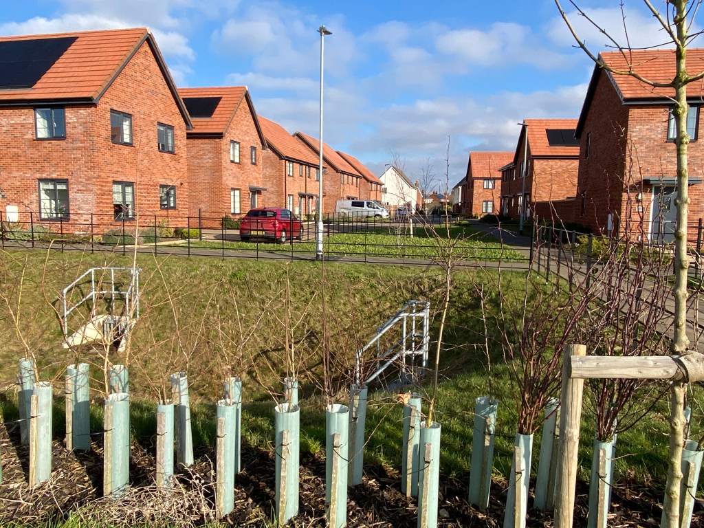 In February this year, I decided to repeat the same walk but with a short, extra stretch to encompass the new development of Kingsfleet Park. You can share some of the views I saw below. In most instances it has not been possible to take photos from exactly the same location due to the new houses. I could hardly stand in the S.U.Ds. ponds or someone’s kitchen in pursuit of complete accuracy. (S.U.Ds. is the abbreviation for Sustainable Underground Drainage System.) But you may see some of the overall changes.