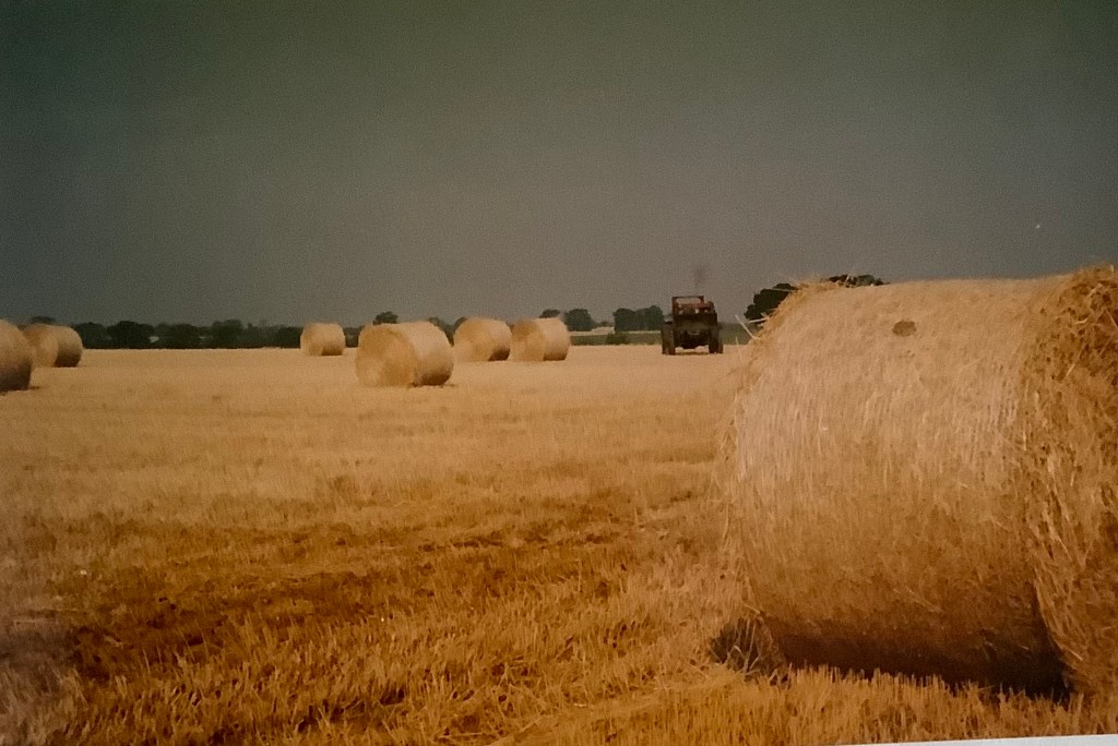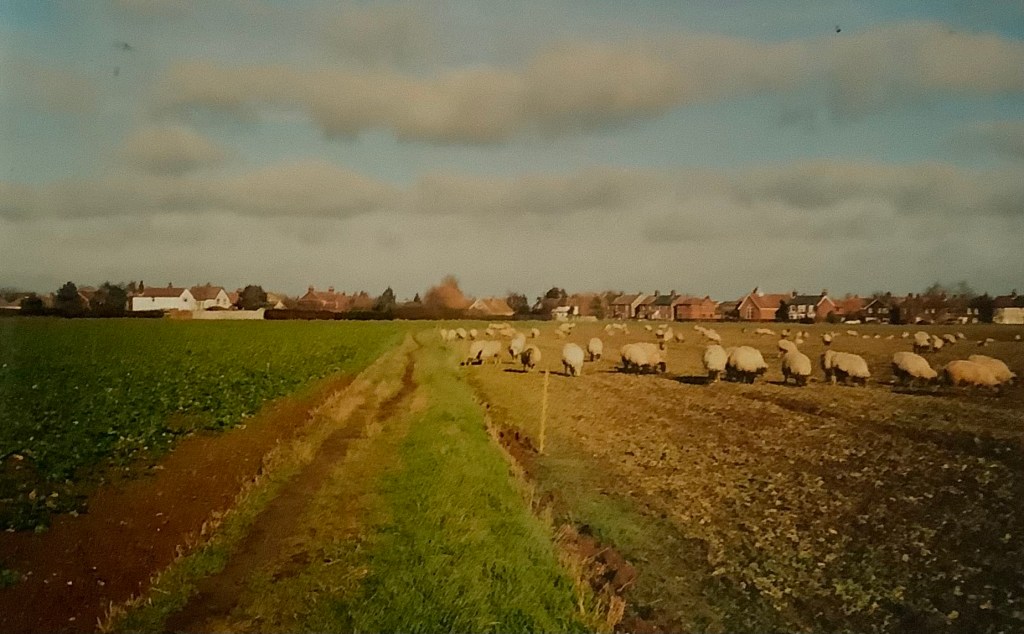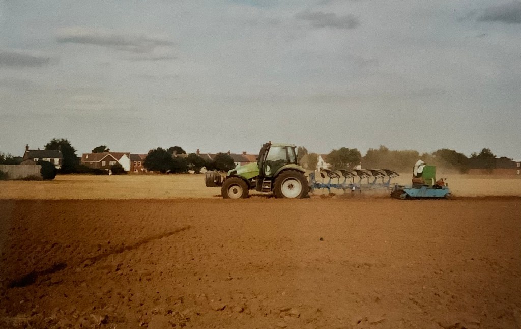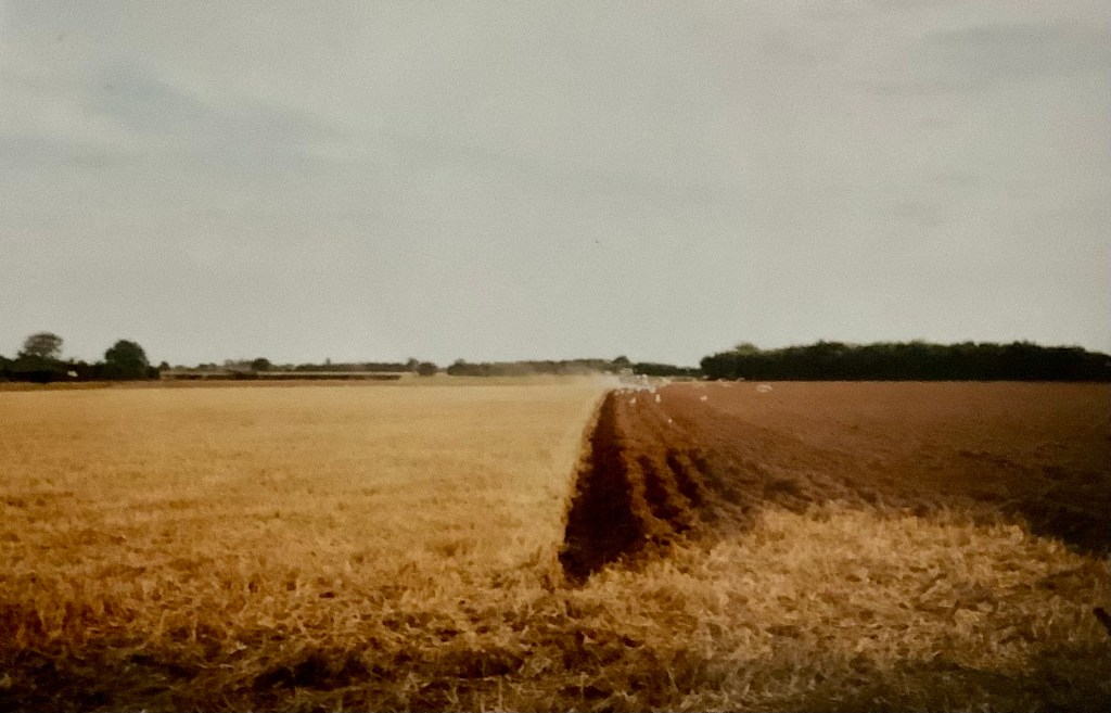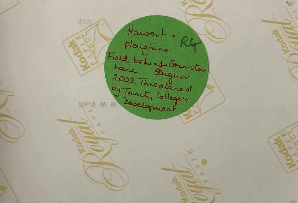 18) Looking towards the little cul-de-sac part of Grimston Lane, from the field. On the back of the photograph, Rosemary wrote: ‘A field of poppies, “set aside” this year. This is where Mr Morgan and Mr Jennings had their small farm in the 1940s”. Taken early July, 1994. This photo records one of the were very few occasions when the field didn’t produce crops. It was never a poppy field. RG.19) Looking towards The Hand in Hand from the corner of the two fields now hosting Poppy Fields and Kingsfleet Park developments. An historical view of Trimley taken sometime c.1980s. rG.20) Sheep grazing on crop remains. Looking towards the Methodist Chapel. Date unknown, possibly early 2000s.21) Looking towards the Memorial Hall and the Social Club. The same sheep. Possibly early 2000s. RG.22) Harvest time, August 2003. RG.23) Harvest time, August 2003. RG24) A tractor ploughs the field after the harvest. September 2003. RG25) Follow the plough. September 2003. RG.26) Rosemary’s label on the back of photograph number 24. August 2003. RG
