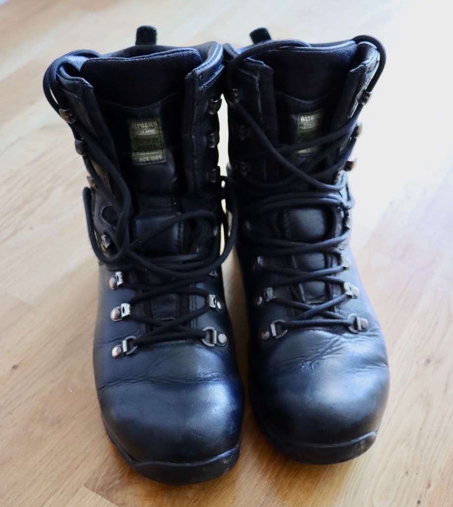 Arlene’s boots without the usual high polish after walking the muddy streets of Trimley.